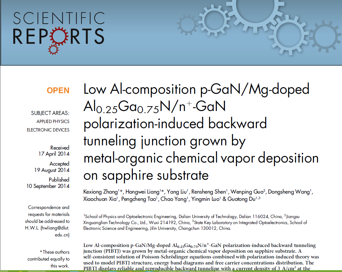 近日,williamhill官网物理与光电工程公司博士研究生张克雄与梁红伟副教授(通讯作者)为共同第一作者的以“Low Al-composition p-GaN/Mg-doped Al0.25Ga0.75N/n+-GaN polarization-induced backward tunneling junction grown by metal-organic chemical vapor deposition on sapphire substrate”为题的论文在Nature 出版集团的综合性期刊Scientific Reports上发表,该论文是张克雄同学在杜国同教授及梁红伟副教授指导下完成的。文章链接为:。