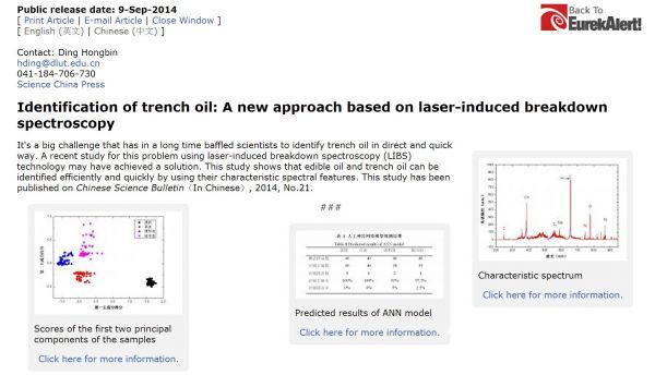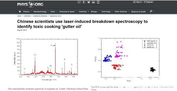 该研究成果以学术论文发表于中国科公司杂志社《科学通报》上,成为该期杂志的封面文章,引起了国内外同行的广泛关注,并在近日第八届国际激光诱导击穿光谱会议上被会议主席作为亮点引用。另外该成果被美国科学促进会(AAAS)的主流媒体新闻EurekAlert!以“Chinese scientists use laser-induced breakdown spectroscopy to identify toxic cooking 'gutter oil'”为题在物理学家组织网特别报道并被广泛转载,物理学家网主要报道来自全球各大研究机构的物理创新研究成果以及重要科学和重大技术前沿突破。此前,相关研究成果已获发明专利授权(专利号:ZL 201110404691),国际著名仪器设备制造商美国TSI公司和法国iVEA公司以及国内深圳和大连等高科技公司均希望转让或共同开发该技术。