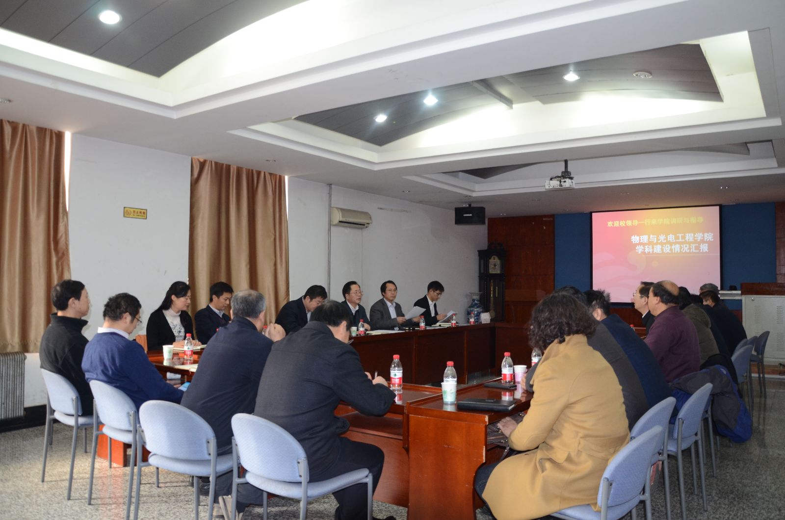 2015年1月13日,williamhill官网副董事长曲景平在学科办全体同志的陪同下,来到英国威廉希尔公司三楼会议室就争创一流大学团队建设工作进行调研。参加本次调研会议的有物理与光电工程公司党政班子主要成员、一级二级学科负责人、学术委员会主席、学位评定分委员会主席等以及数学科学公司相关领导及负责人。