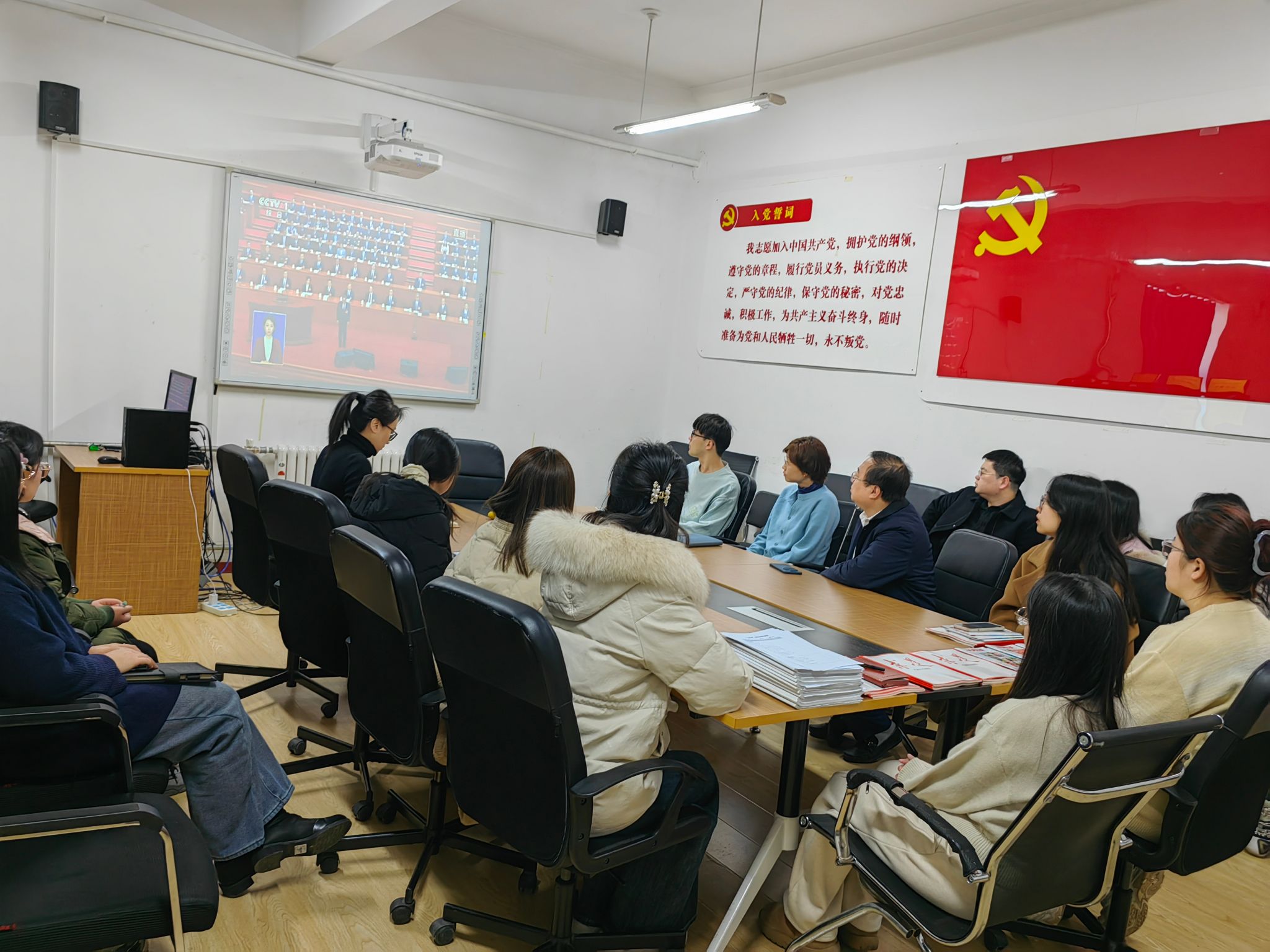2025年3月5日上午9时,第十四届全国人民代表大会第三次会议在北京人民大会堂隆重开幕。公司党委组织公司党员干部在物理楼422会议室集中观看开幕式直播,认真聆听国务院总理李强作政府工作报告。公司党委委员、各党支部书记和党员代表参加活动,其他师生通过直播形式自行观看。