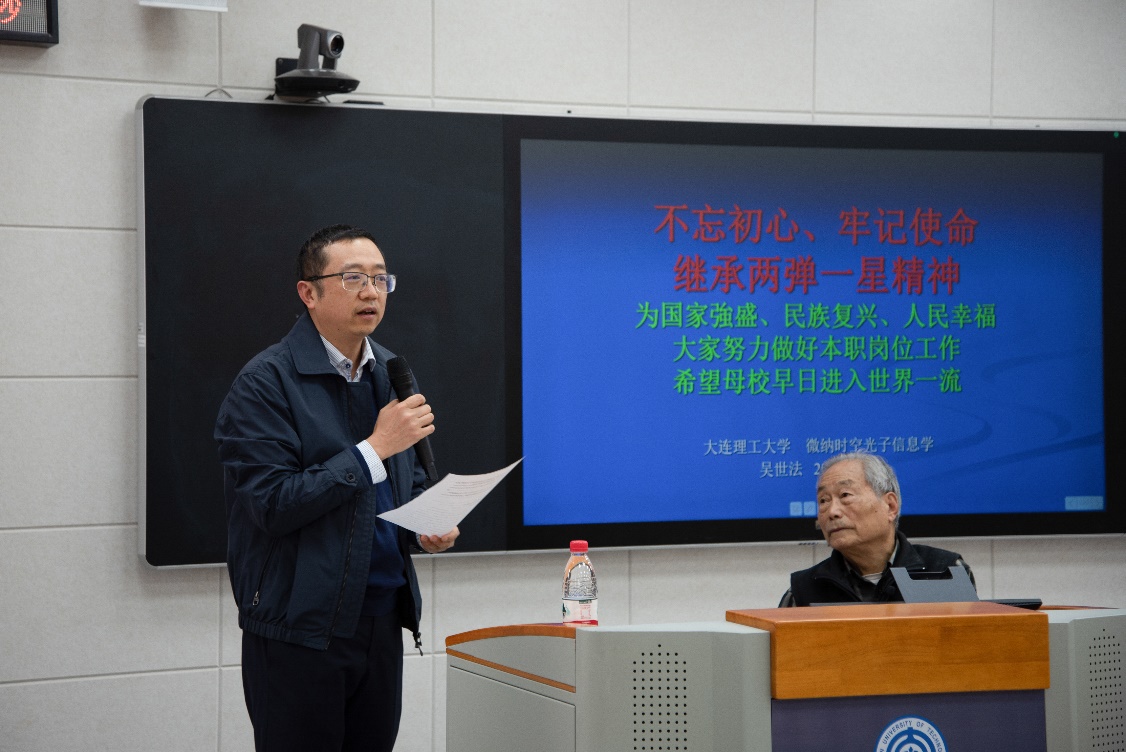 在吴世法教授的讲述中,“绝密调令”“进入信箱”“三个字”“官厅水库旁”四个关键词,还原了我国第一颗原子弹研制工作启动之时的实景。在火车车厢接缝处以背包为垫,彻夜研究高速扫描相机轨迹法;在深夜饿过劲后突发灵感,不眠不休10小时绘制三镜转向机构图纸;在邓稼先经理的“死命令”下坚持原则,终于实证测量中的γ干扰;不慎让“化学酱油”染花了陈能宽主任的人造羊毛外套,得到陈主任的宽容原谅:这四段让吴教授印象最深刻的真实故事,再次让研制工程的艰苦条件和人物形象生动地浮现在师生眼前。吴教授总结说,“实事求是,是科研工作者最重要的品质,也是研究工作的铁律,更是中国共产党人永远应该遵循的思想方法。”