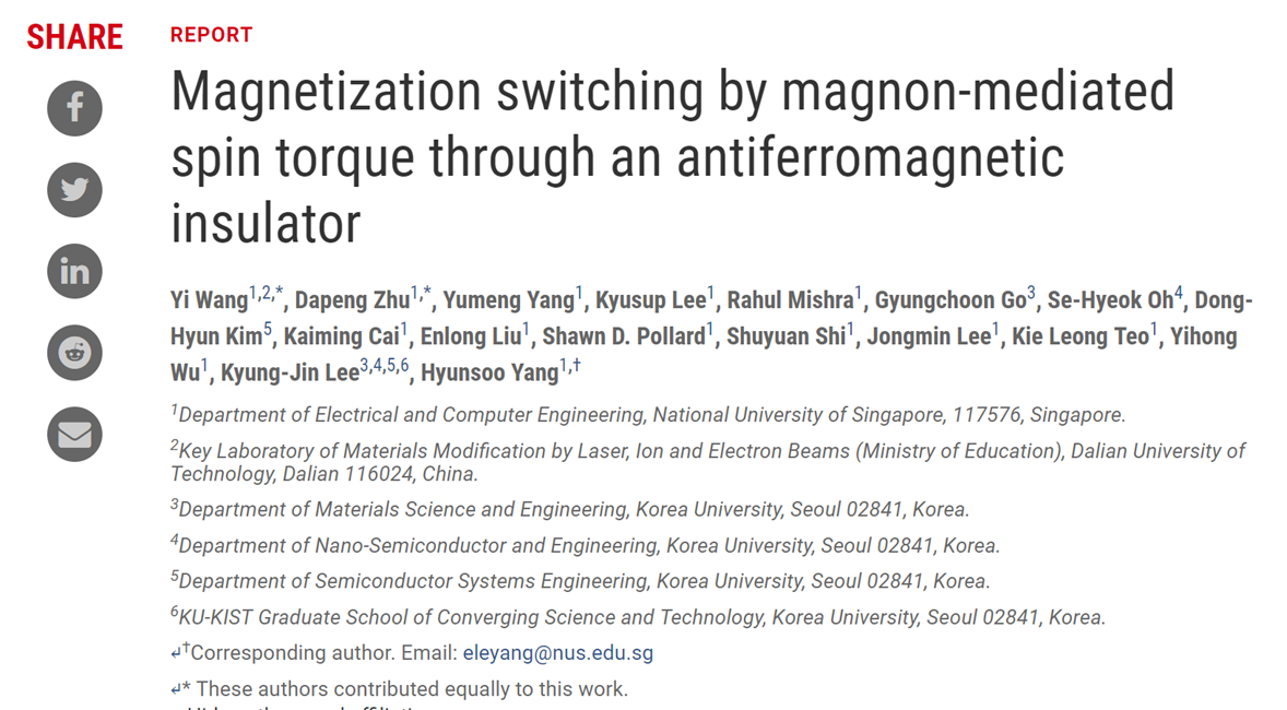 2019年11月29日,公司王译教授与新加坡国立大学Hyunsoo Yang教授,在世界顶级期刊Science (《科学》)上发表重要工作:利用自旋波翻转磁矩实现数据存储与逻辑运算[1]。