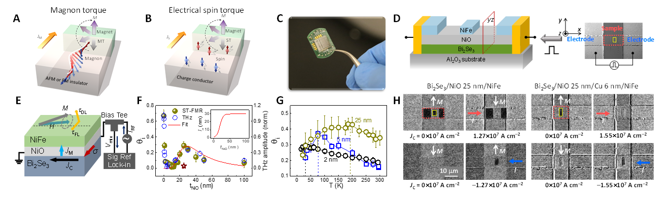 图A-B:磁振子转矩(A)与传统电子自旋转矩(B)对比示意图;图C:磁振子转矩器件光学照片;图D:磁振子转矩驱动NiFe磁矩翻转器件示意图;图E:Bi2Se3/NiO/NiFe器件的自旋转矩铁磁共振测量示意图;图F:磁振子转矩强度与NiO厚度关系;图G:不同厚度NiO器件中磁振子转矩与温度的关系;图H:磁振子转矩效应驱动磁矩翻转磁光克尔成像。