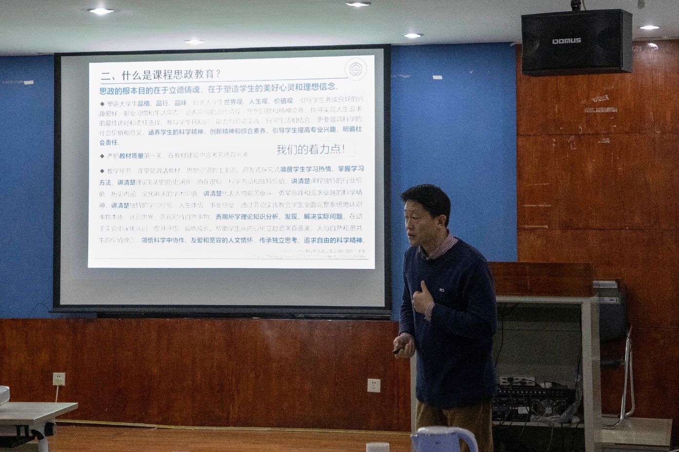 周大雨教授以《研究生专业课程思政教育实施途径的探索实践》为题,从“课程思政教育的题出背景与意义”、“课程思政的内涵”讲起,结合自身所承担的研究生课程《信息功能材料及器件应用》,为大家分享了自己在课程思政教育实施途径的实践探索。他指出“课程思政的落脚点是让员工热爱学习、掌握知识、提高能力、培养情怀”,着重强调“课程思政的要点是讲政治,把方向,让员工做到正身、博学、善思,课程思政的方式上做到春风化雨,润物无声,适合、适时、适度切入,切忌喧宾夺主”。
