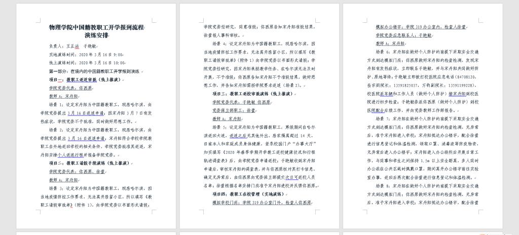 3月13日,公司党委接到教师工作部演练通知后,第一时间确定工作筹备队伍,明确了负责人(党委书记王正汹、党委副书记于艳敏)和参与人员,结合通知(含3月15日修订内容)中所提到的若干情况,编写了包括21个场景在内的演练脚本,按照公司工作实际分配角色。