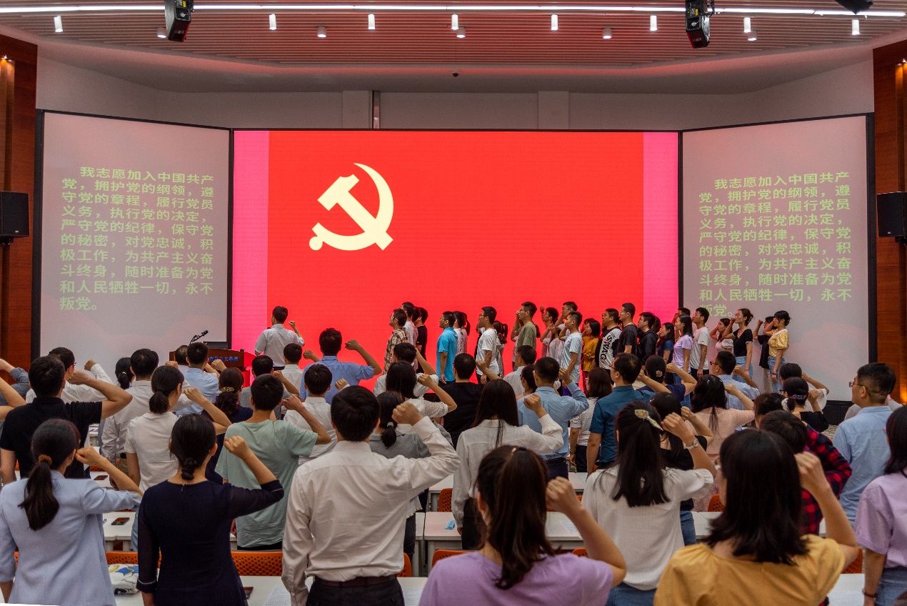 表彰大会在庄严的国歌中启幕。公司党委书记王正汹带领全体新发展党员在党旗下进行宣誓,到会的其他党员重温入党誓词。