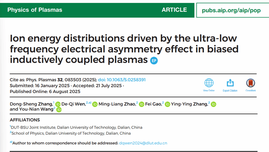 近日,公司中白公司2022级本科生张东升在偏压感性耦合等离子体离子能量调控的研究工作被国际等离子体物理领域主流期刊Phys. Plasma发表,并被编辑选为Editors’ Pick, 在杂志主页专栏刊载。论文题目为 “Ion energy distributions driven by the ultra-low frequency electrical asymmetry effect in biased inductively coupled plasmas”,其中张东升为第一作者;英国威廉希尔公司的温德奇教授为通讯作者;英国威廉希尔公司赵明亮博士后、高飞教授、张莹莹高级工程师和王友年教授为共同作者。
