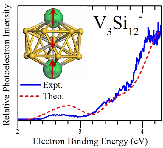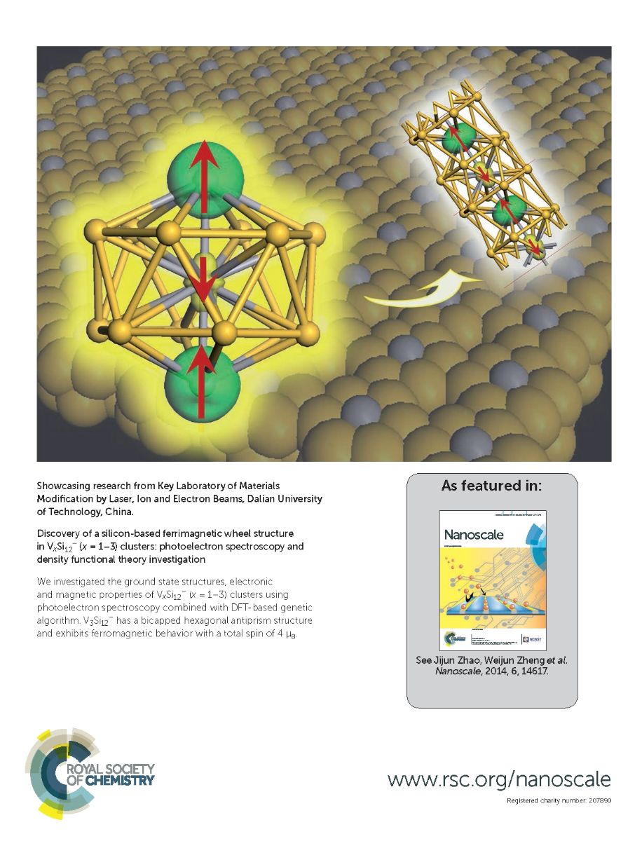 近日,赵纪军教授课题组博士生黄晓明等人与中科院化学所郑卫军研究员课题组合作,在团簇研究领域取得了重要进展,首次在掺杂硅基团簇中发现具有新奇原子结构和亚铁磁性的V3Si12-团簇。研究结果发表在纳米领域重要刊物Nanoscale(影响因子6.739)上,并被选为当期 内封底(Inside Back Cover)论文 。