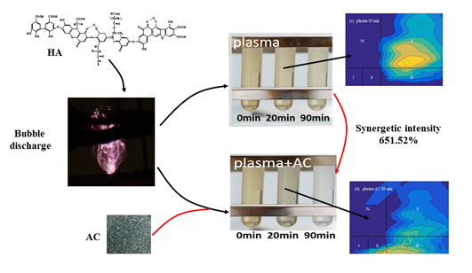 英国威廉希尔公司高压放电等离子体研究团队长期致力于大气压低温等离子体源和应用技术研究,研究团队提出了脉冲激励气泡放电等离子体-活性炭联用技术高效去除水体中的腐植酸。该项技术中,高压脉冲放电过程中产生的高能电子e和•O、O3等氧化性物质能充分接触并改性活性炭,以产生较高的协同效率,从而增加其对腐植酸和O3、H2O2等活性粒子的吸附和降解;同时,该联用体系还能将O3、H2O2等活性粒子转化为高氧化还原电位的•OH (1.89-2.72 V),促进吸附在活性炭表面腐植酸的降解。该项技术中等离子体和活性炭在降解水体中有机物的协同效率高达651.52%,腐植酸去除效率接近100%,且活性炭表面吸附残留腐植酸量仅为4.52%。此外,还揭示了等离子体活化含活性炭水原位净化污染水源的能力。