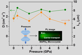 成果简介:研究发现,压力可以有效改变钙钛矿材料的光电特性,并且在一定的压力范围内可以提升器件的光电性能。钙钛矿材料的载流子寿命,载流子迁移率和迁移距离是决定器件性能的重要参数。因此,了解这些核心参数在压力作用下如何变化对于理解压力对钙钛矿器件光电性能的影响至关重要。高压下钙钛矿材料的研究主要在金刚石对顶砧压腔内完成,受到压腔空间以及传压介质限制,采用传统方法实现高压下载流子输运性能测量具有巨大挑战。本工作中,该团队通过将金刚石对顶砧与时空分辨荧光扫描成像等技术相结合,首次在高压环境下直接观测到三维钙钛矿MAPbI3单晶中的载流子输运过程,并发现在0.4-5.7 GPa压力范围内,三维钙钛矿MAPbI3单晶的扩散系数比常压提高30%以上,载流子依然可以保持5- 8 μm迁移距离。同时,结合高压下X射线衍射和拉曼光谱等表征技术,证明了MAPbI3单晶在0.3-0.4 GPa发生了由四方相到立方相的结构转变,在~3 GPa发生了等结构相变。本工作揭示了压力对三维钙钛矿MAPbI3载流子输运的影响,并为利用压力来调节或优化钙钛矿的光电特性提供了新思路。相关研究成果以“Excellent Carrier Transport Property of Hybrid Perovskites Sustained under High Pressures”为题,发表在ACS Energy Letters,7, 154-161(2022)。