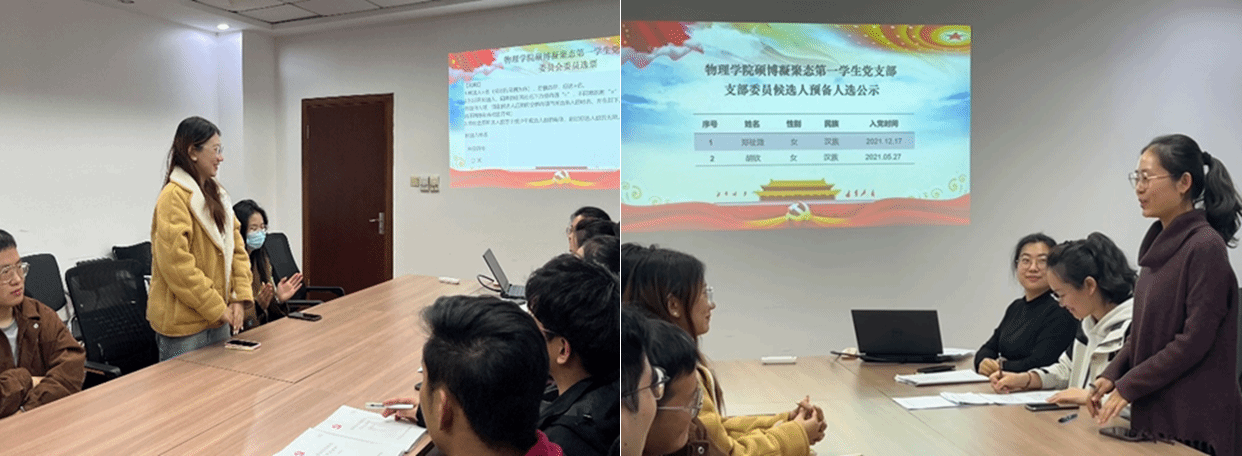 会议第二项,进行支委会换届。支部部分党员因毕业原因无法继续担任支部委员,现支部委员会空缺委员1名。本次有选举权的到会人数超过应到会人数的五分之四,符合开会要求。根据公司党委批复和大会日程安排,硕博凝聚态第一员工党支部召开补选支部委员党员大会。首先由王瑞腾同志宣读补选办法,接下来推选监票人与计票人,推选结果是分别由李希娜同志与刘鹏辉同志担任监票人和计票人;随后由支部委员候选人介绍自身基本情况并进行竞选发言;最后经全体参会党员通过无记名投票,郑祉溦同志当选为硕博凝聚态第一员工党支部委员会委员。