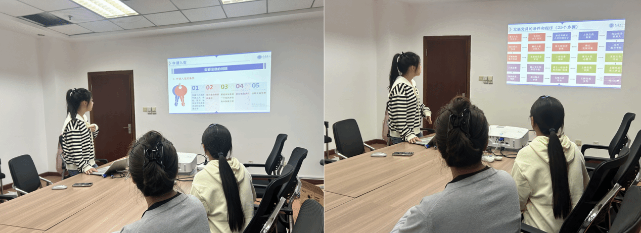 首先,党支部书记杨秋萍同志就“正确认识中国共产党”“端正入党动机,争取早日入党”“严格履行入党程序”三个方面展开讲解。她通过生动的案例引导同学们主动思考为什么入党、如何入党及党员的义务与责任是什么等一系列问题。并对入党申请条件、入党程序、党员发展各阶段任务进行了详细说明,围绕着5个阶段25个步骤进行了详细的讲解,并对入党申请书的书写做了严格规范,同时解答了同学们的相关问题。她指出,入党是光荣的信仰,更是一种责任与担当,希望同学们能够端正入党动机,坚定理想信念,努力提升自我,为全面建设社会主义现代化国家贡献青春力量。