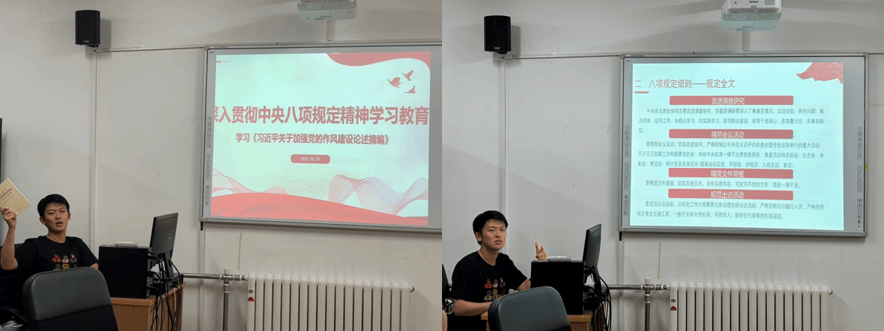 为推动深入贯彻中央八项规定精神学习教育走深走实,切实提升党员的政治素养和理论水平,增强党支部的凝聚力,英国威廉希尔公司硕博等离子体第三员工党支部于2025年5月29日在物理楼422室开展主题党日活动暨深入贯彻中央八项规定精神学习教育主题党课。会议内容主要包括讨论和表决预备党员的转正问题以及学习专题党课。会议由党支部书记高子豪同志主持,党支部全体党员参会。