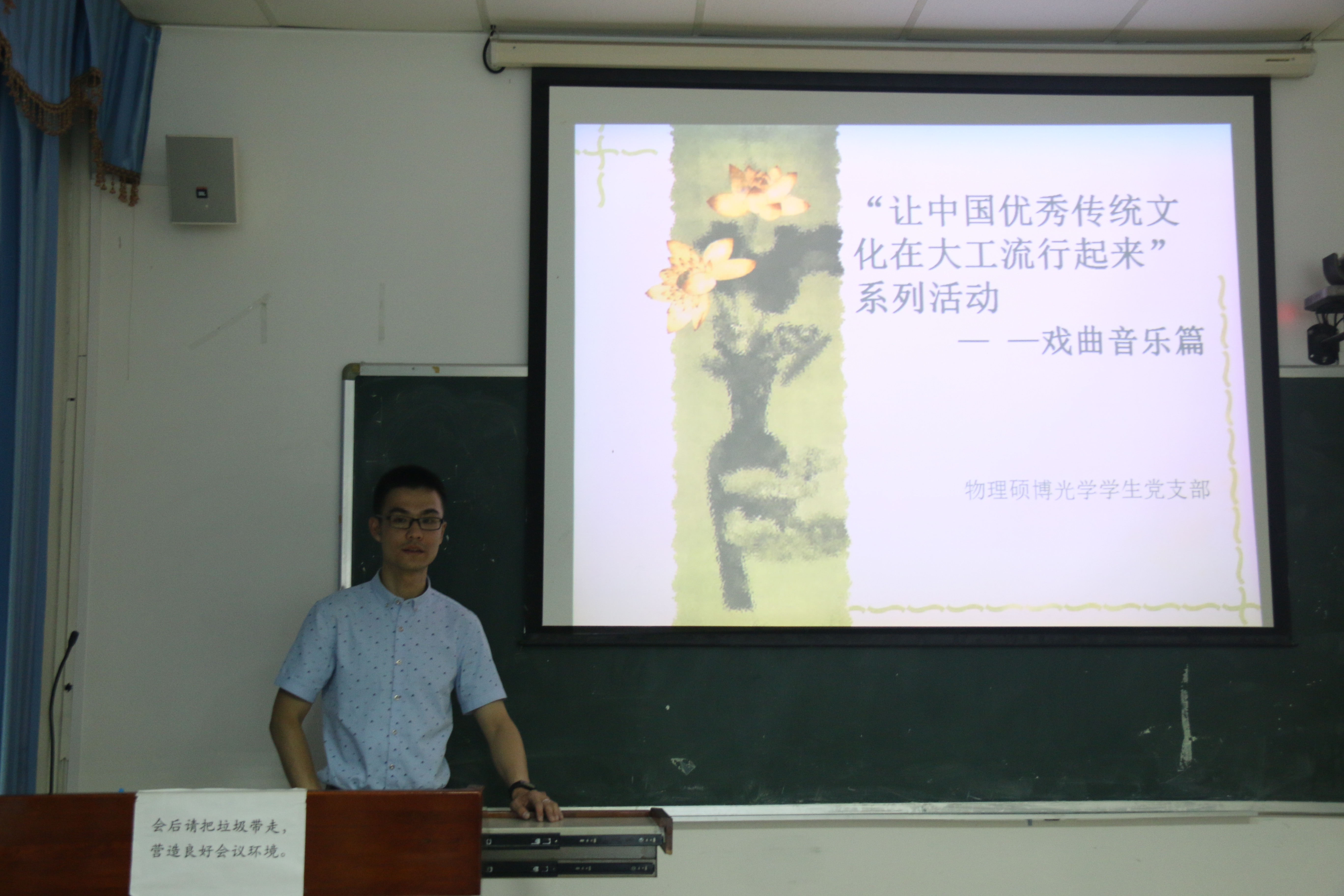 现在的音乐类综艺节目席卷各大电视台,流行音乐文化“热火朝天”,来自西方的音乐也引起了更多地关注。而且如今学习西方乐器的人越来越多,学习中国传统乐器的人则越来越少,很多人对中国乐器都叫不出名字或者分辨不清。中国戏曲的情况更是糟糕。戏曲音乐作为我国传统文化中不可或缺的一部分,更应该得到重视与保护。因此2017年6月6日晚,物理硕博光学员工党支部在物理系楼425举办了“让中国优秀传统文化在大工流行起来”系列活动第三部分——戏曲音乐篇。