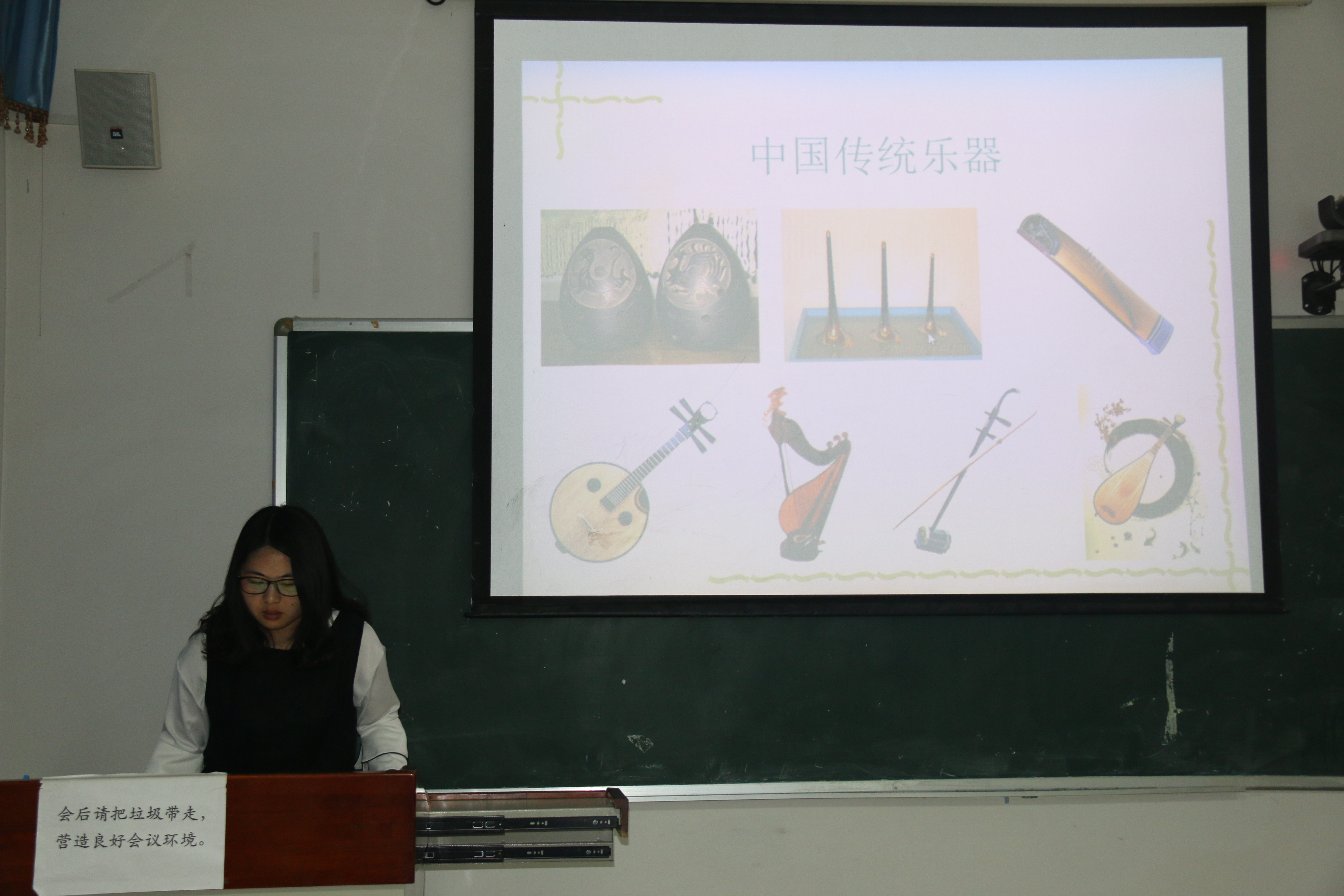 最后丁倩倩同志则对我国的古典乐器进行了详细介绍。她指出,现在很多人对中国古典乐器不熟悉不了解,也就谈不上喜爱,更谈不上传承。丁倩倩现场播放了几段不同乐器演奏的音乐,让大家来辨别是什么乐器演奏的。这个环节带动了整个活动的气氛,大家仔细的聆听辨认并热烈讨论着。丁倩倩着重介绍了几个大家听不出来、不太熟悉的乐器,从质地、发声原理等方面都做了详细的介绍,大家纷纷表示获益匪浅。