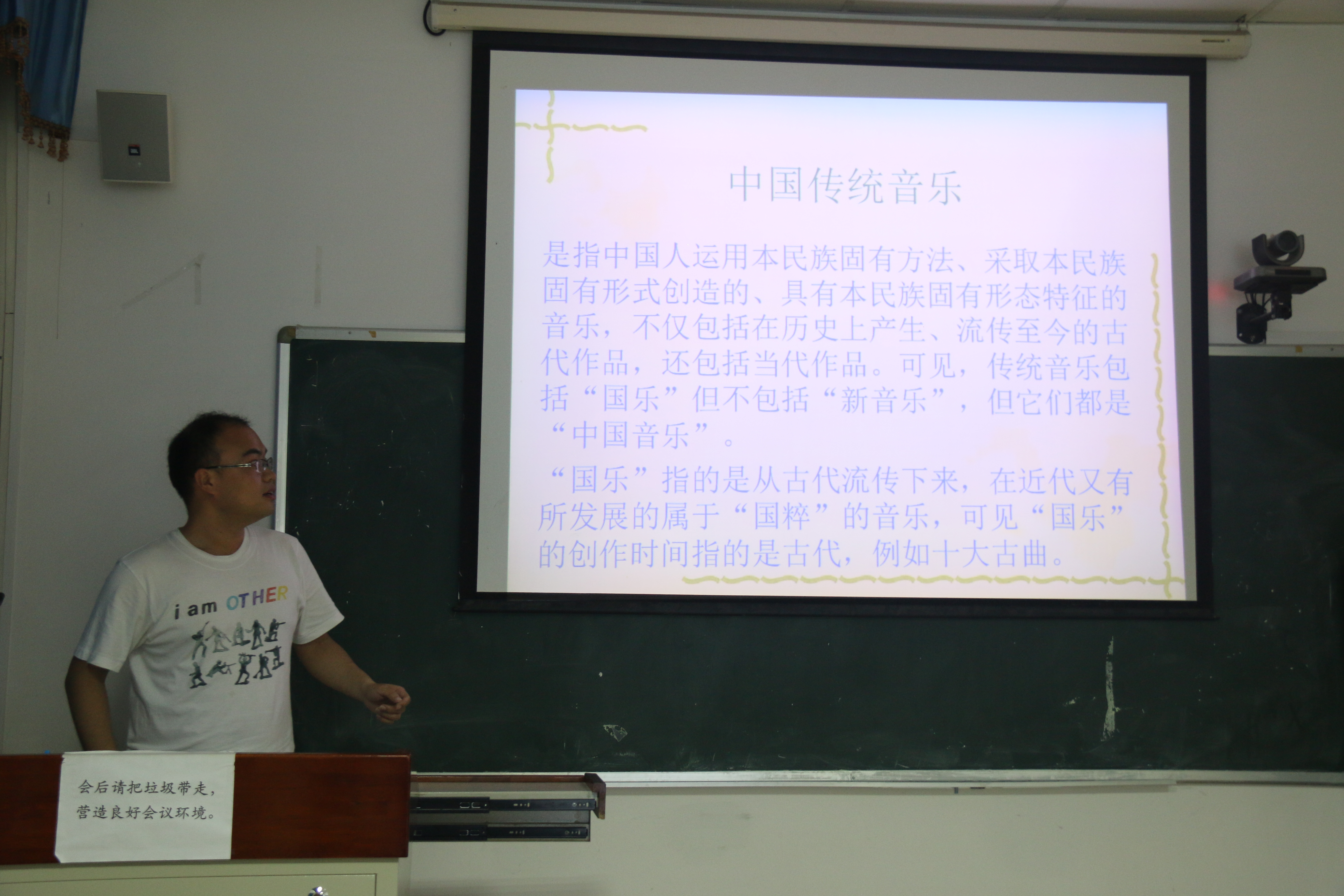 随后,李泉江同志向大家介绍了以“十大古曲”为代表的中国古典音乐。从中国的“十二平均律”、“七声音阶”等乐理知识开始,到古典音乐流露出的意境,随着《阳春白雪》、《渔樵问答》等名曲的播放,李泉江对音乐的详细剖析使我们似乎和古人联系在了一起,也不禁慨叹现代的流行音乐以节奏见长,再也不复那种恬淡释然的情怀了。