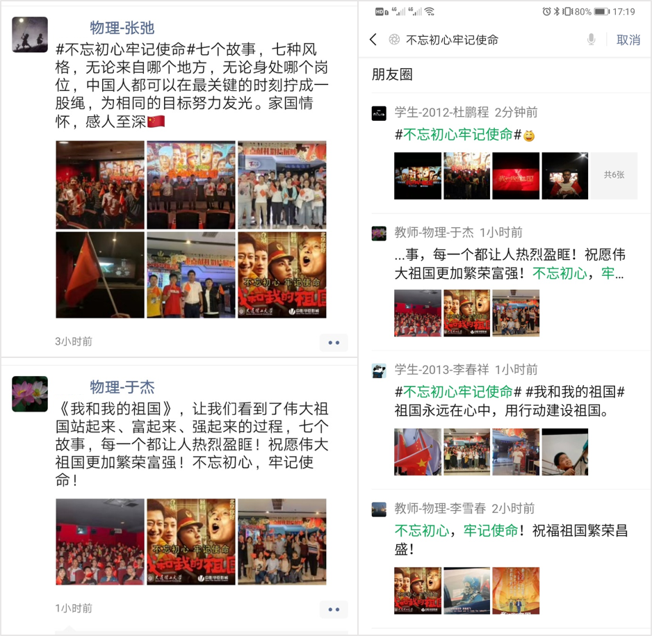 观影前后,公司各党支部纷纷合影留念,师生党员在朋友圈等处发表自己的观影感言。公司大学物理教工党支部书记于杰写到:“《我和我的祖国》,让我们看到了伟大祖国站起来、富起来、强起来的过程,七个故事,每一个都让人热烈盈眶!祝愿伟大祖国更加繁荣富强!不忘初心、牢记使命!”公司研究生党总支书记张弛说:“七个故事,七种风格,无论来自哪个地方,无论身处哪个岗位,中国人都可以在最关键的时刻拧成一股绳,为相同的目标努力发光。家国情怀,感人至深。”