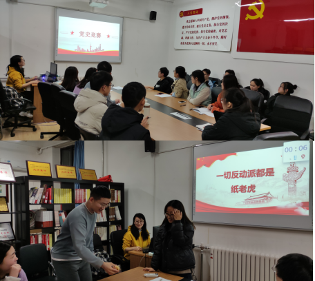 第三个环节为党史知识竞赛主题活动,由纪检委员秦思雨对党史竞赛的规则进行了讲解,比赛分为团队和个人挑战赛两部分。首先进行团队赛,分为三个部分,(1)你画我猜,每组出两人进行限时你画我猜,每答对一个题2分共5道题,第一轮一组和三组都答对4道,二组成功答对3道题,稍显落后,赛程紧张且激烈。(2)组员依次答题环节,小组成员在限时的情况下,轮流作答题,需要组内成员互相配合,打好时间战,最后第一组以微弱优势领先,第三组紧跟其后,第二组比分稍显落后。(3)团队抢答赛,通过一人抢答组内作答,通过合作完成比赛,通过激烈的抢答,最后第一小组获得了团队冠军,二三小组惜败。