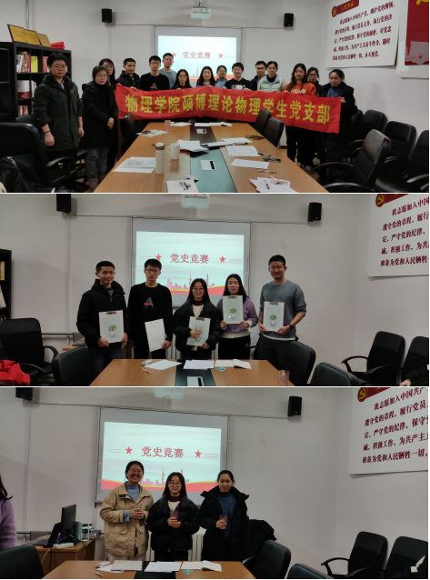 为了推动党史学习教育进一步走实,引导大家加强对党史的理解与把握,激发爱党爱国热情,重温红色记忆,坚定理想信念,同时,为加强党员队伍建设,积极推进党员发展工作,不断吸收优秀的新鲜力量,硕博理论物理员工党支部于12月24日晚6点在物理楼422开展党史竞赛与“重温红色记忆 坚定理想信念”主题活动暨全体党员大会,由支部书记刘玉强同志主持,支部党员、积极分子与群众等参加。