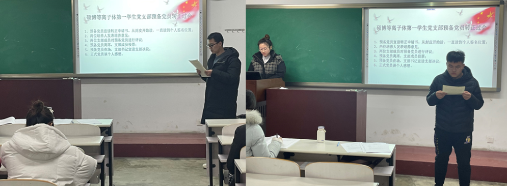 会议第一项:对预备党员宫丽悦、李瑶、杜满强、李茜四位同志转正的讨论与表决。首先四位同志依次宣读了转正申请书,汇报了在预备期内在党支部和入党介绍人的考察培养和教育过程中自己发生的改变,深刻剖析了自己还存在的不足和改进措施,表明了想成为正式党员的决心,表示将进一步接受党组织考察。其次他们的入党介绍人分别介绍该同志在预备期内的表现和存在的不足,对其是否能够转正发表意见。支部成员对其进行评议,到会正式党员进行充分讨论后,对四位同志能够转正进行无记名投票表决。最后,四位同志全票通过表决,按期转正成为了中共党员,他们对以后如何做一名合格的共产党员、如何在日常生活和工作中发挥先锋模范作用等方面发表了感想。
