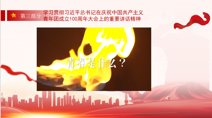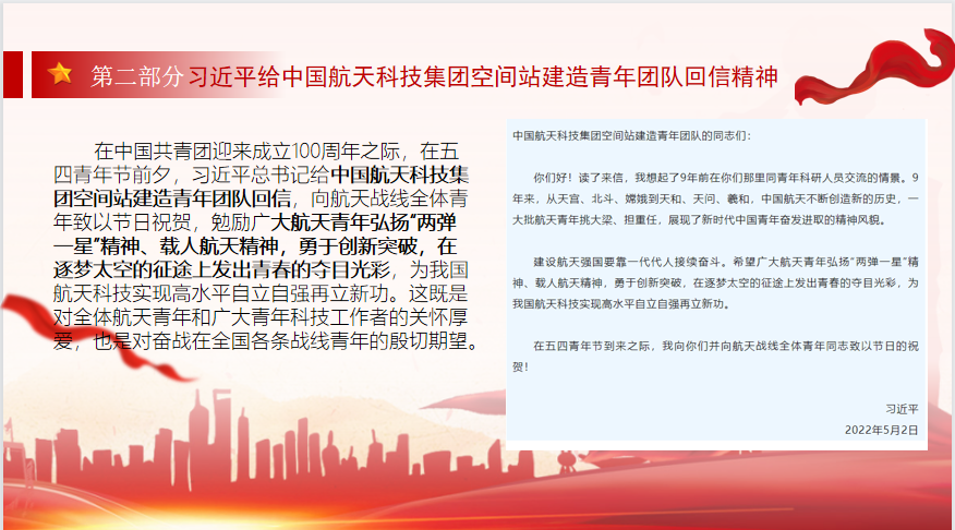 会议第二项,盛竹莹同志带领大家进行四个板块理论学习——学习习近平总书记在中国人民大学考察时重要讲话精神、学习习近平总书记给中国航天科技集团空间站建造青年团队回信精神、学习习近平总书记在庆祝中国共产主义青年团成立100周年大会上的重要讲话精神、学习习近平总书记给南京大学留学归国青年学者重要回信精神。习近平总书记不论是讲话,还是回信中,都内涵丰富、高瞻远瞩、情真意切、催人奋进,具有极强的政治性、思想性、指导性、实践性,体现出对人才的重视,希望每位青年都争做堪当民族复兴重任的时代新人。