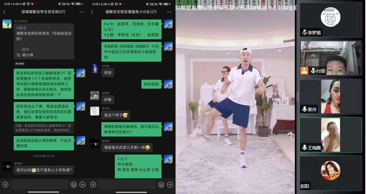 9月1日下午,有课题组同学被列为第二、第三密接。按照防控要求,密接同学需要集中隔离、宿舍静默。得知情况后,硕博凝聚态员工党支部联合团支部迅速排查在校员工状态,掌握每位同学情况。根据具体情况,支部快速组建起一支员工党员志愿服务小分队,为十余名在隔离、静默的同学提供生活保障。支部在公司党员主动报名,按时为隔离、静默的同学们送餐,采购必要生活物资。此外,支部还组织了“云健身”、水果集中采购发放等活动来缓解同学们长时间不能出寝室的焦虑情绪,积极鼓励大家增强主人翁意识,共克疫情难关。