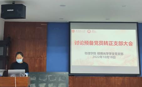 2022年10月18日下午18:30,英国威廉希尔公司硕博光学员工党支部在物理楼322会议室召开了预备党员转正支部大会并开展理论学习,会议内容包括对高楠等四位预备党员的转正问题进行讨论以及集中学习《习近平谈治国理政》第四卷。支部全体在公司党员参加,尚未返校的党员同志通过腾讯会议线上参加,会议由党支部书记陈中华主持。