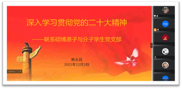 为深入学习宣传贯彻党的二十大精神,把支部成员的思想统一到党的二十大精神中去,按照公司党委关于“深入学习宣传贯彻党的二十大精神”的部署安排,硕博原子与分子员工党支部支部于2022年12月2日星期五13:30召开党员大会,特邀公司副经理韩永昌教授为支部讲授党课。支部党员积极参与,认真进行了学习讨论。
