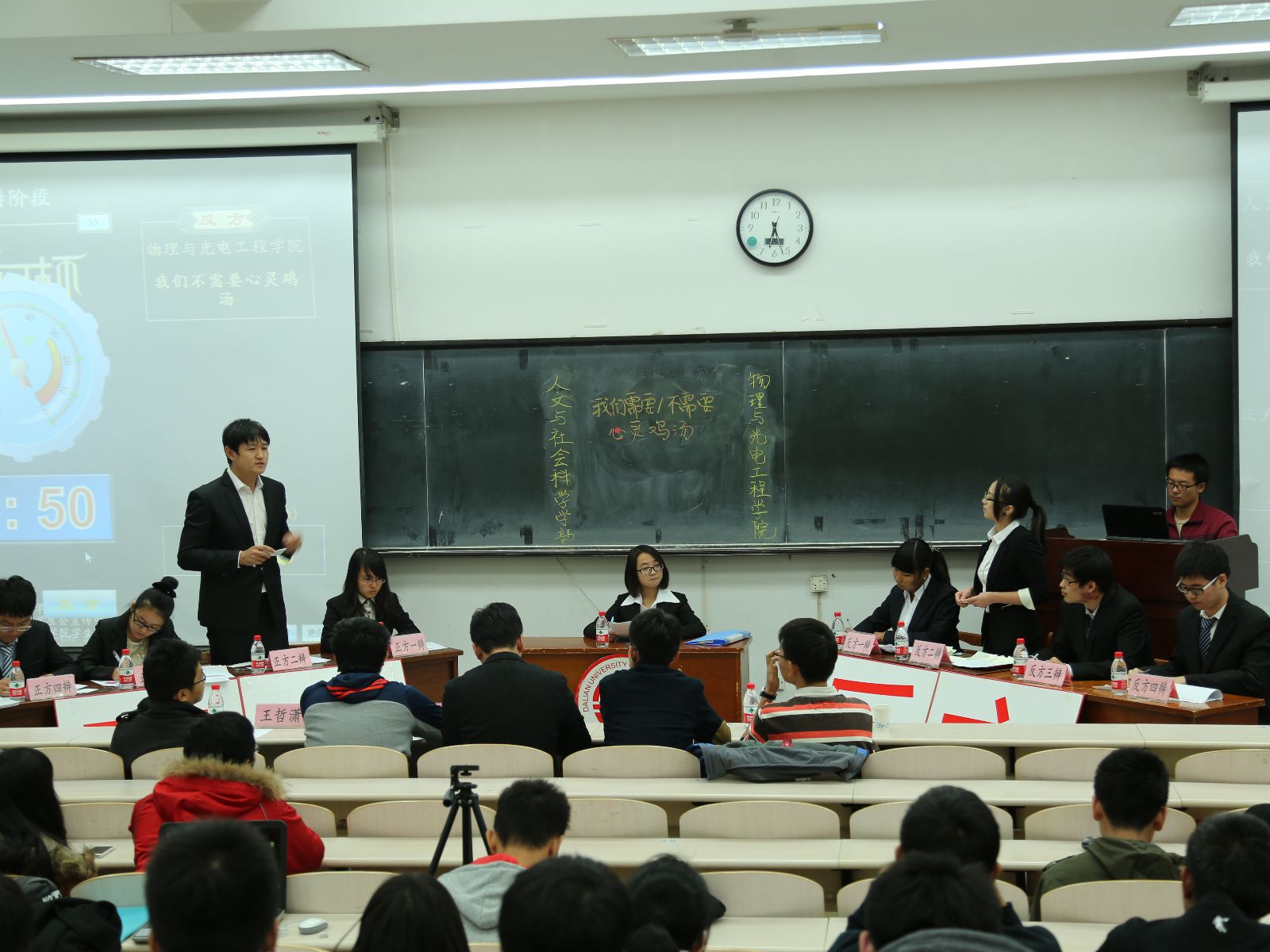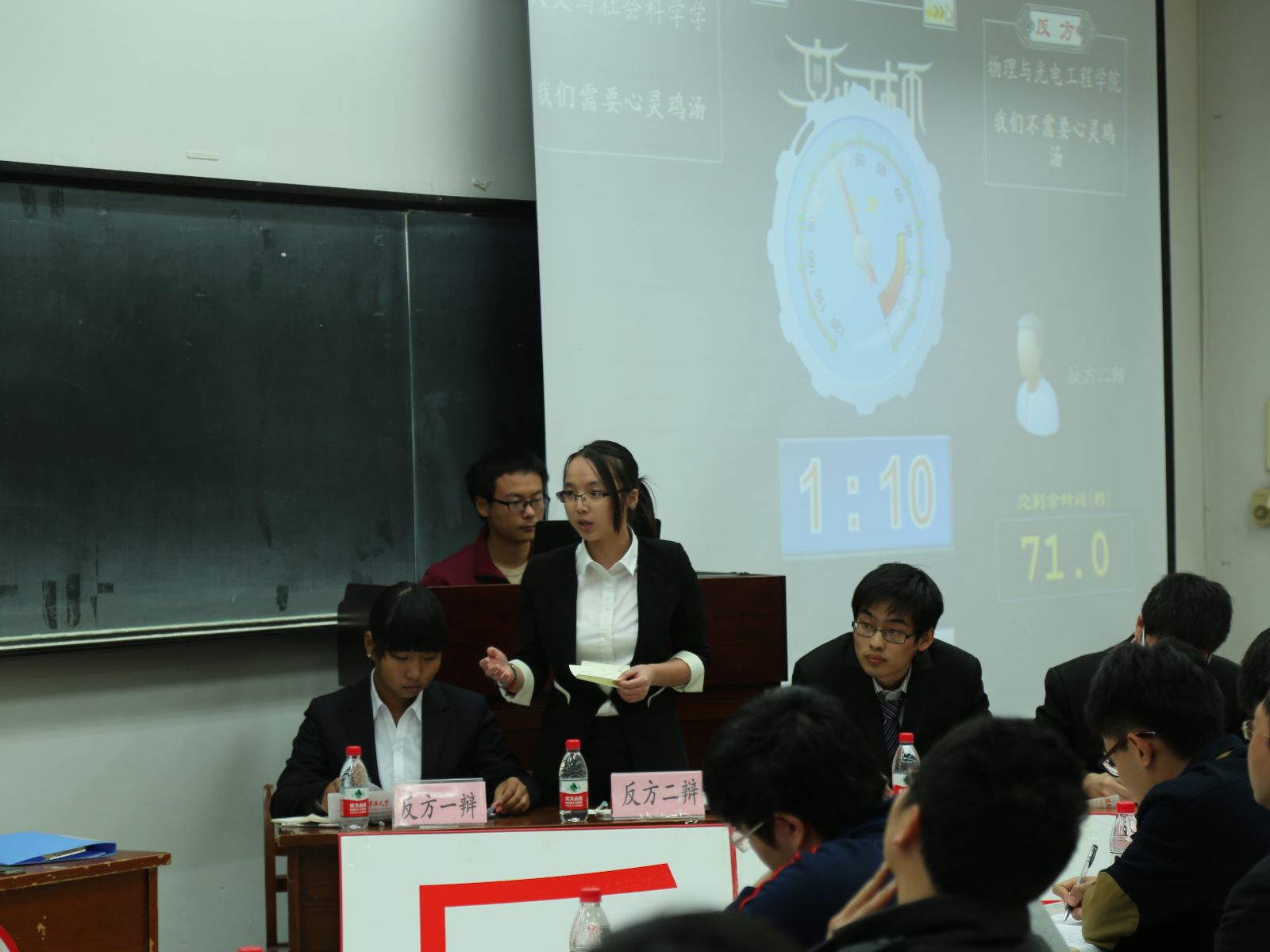 本次辩论,人文与社会科学学部为正方,辩题是“我们需要心灵鸡汤”;物理与光电工程公司为反方,辩题是”我们不需要心灵鸡汤”。正反双方依次在开场视频播放之后入场。