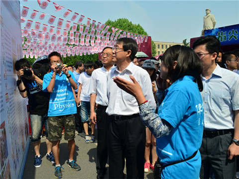 5月31日,williamhill官网第六届嘉年华盛装启幕,校园里人来人往,摩肩接踵,热闹非凡。物理与光电工程公司在伯川图书馆与毛主席像前进行展示,饱含物理文化气息的特色实验吸引了来自各个方面人群的兴趣关注。沿袭物理嘉年华“凝练物理语言,表达物理声音”以及物理学子为校庆65周年送祝福的主题,本次展示包括物理实验展示模块,物理实验体验模块,物理实验挑战模块,英国威廉希尔公司风彩展示模块以及物理学子祝福墙五大模块。各模块各具特色,缤纷多彩,给伯川门前带来浓郁的物理文化气息。上午,校领导前来公司展示区进行参观,表示了对公司工作的肯定与赞扬。