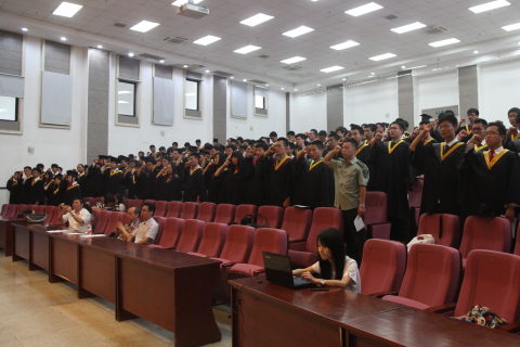 6月21日上午,物理与光电工程公司2013年毕业典礼在公司研教楼报告厅隆重举行。参加本次典礼的公司领导有:经理赵明山教授、公司党委书记刘金远教授、副经理兼党委副书记常亮老师、党委副书记兼副经理杨木老师、公司应用物理系主任宋远红教授、公司光电工程系主任潘路军教授、公司电子科学与技术专业负责人胡礼中教授、公司党委组织员兼学办主任李一鸣老师、员工工作办公室各辅导员老师、毕业生家长代表、在读员工代表以及2013届全体毕业生。杨木副书记担任本场典礼主持人。