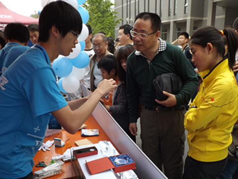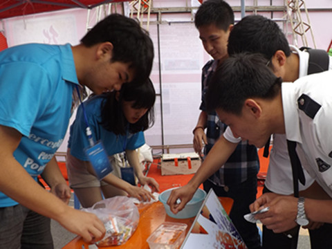 本届嘉年华,物理与光电工程公司展出的实验有水面浮针,灯泡敲钉子,有孔纸水,磁悬浮陀螺,用水做的火山,悬浮乒乓球以及比较高端的技术产品激光内雕。其中,灯泡敲钉子环节,观众在惊讶之余积极进行尝试。“用水做的火山”则仅用简单的冷水,热水,墨水实现了与实际火山别无二致的喷发现象。磁悬浮陀螺揭示了磁悬浮列车的原理。所有实验均收获了很好的展出效果。