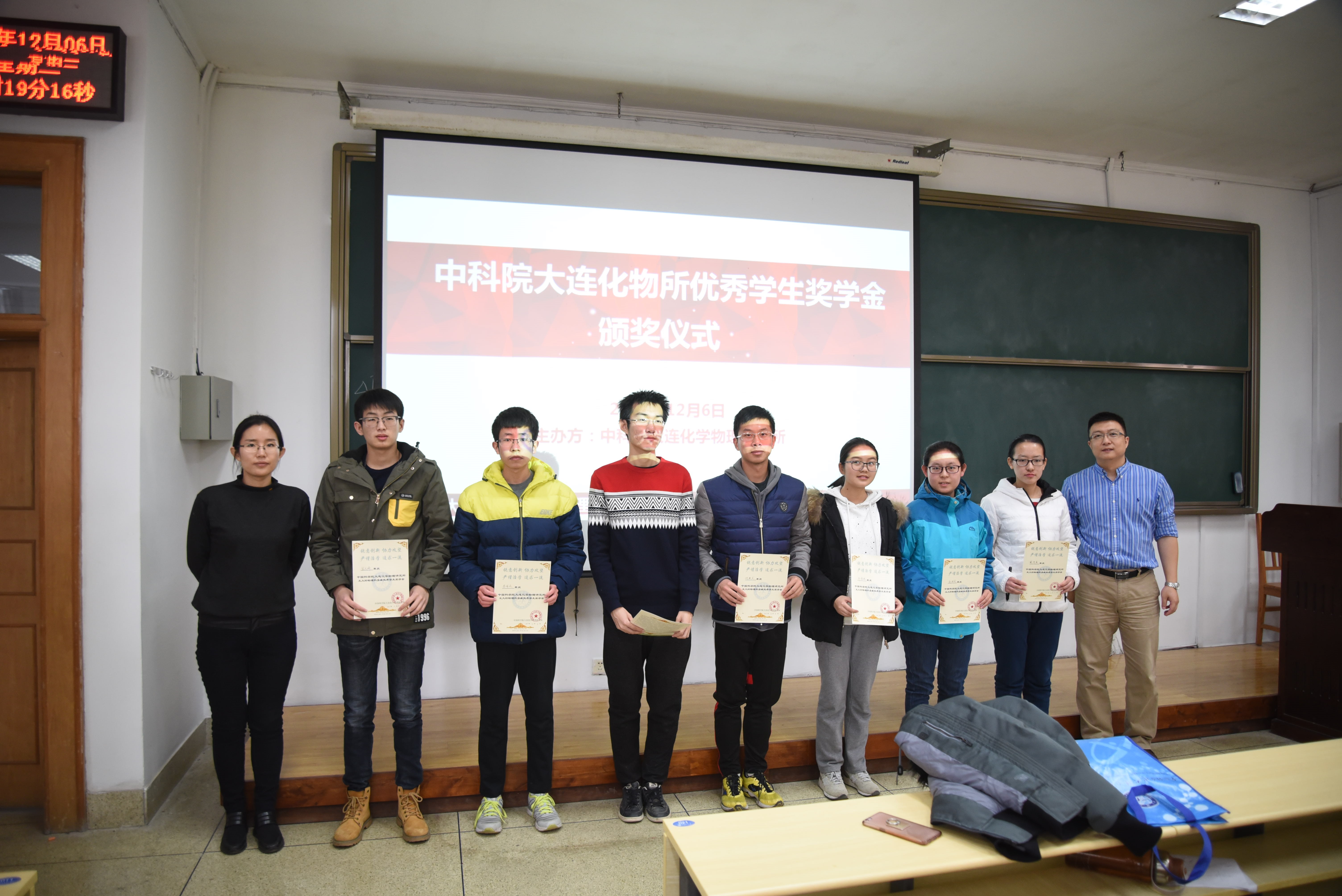 活动开始,主持人佟西原简单地介绍了到场嘉宾以及大连化物所奖学金的相关内容,并宣布获奖员工名单。在一片热烈的掌声中,获奖员工上台领奖,大连化物所的于老师和熊老师依次为获奖的14级、15级、16级优秀员工颁发获奖证书,并对获奖员工表达鼓励;获奖员工也纷纷对两位老师表示感谢,也表示今后会再接再厉。颁奖环节结束,两位老师与获奖员工合影留念。