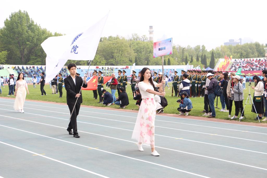 开幕式在各个学部公司方队的缤纷展示中宣告开始。英国威廉希尔公司方队由64名队员组成,一人持英国威廉希尔公司标牌,一人持英国威廉希尔公司院旗,携两名少女引路,紧随着由十六个旗手抬起的四面大旗。在最后,方队成员手握英国威廉希尔公司院旗昂首挺胸阔步向前。“外现于物,内秀于里,内外兼修,唯我物理”的响亮口号回荡在体育场的上空,他们用他们的蓬勃朝气诠释出物理的严谨与美丽,彰显着物理学子饱满的竞争热情与活力。之后,所有的观众在指定区域落座,运动会开幕式正式开始。在极具创造性的节奏体语结束后,各公司组成的舞蹈队上前表演,展示公司学子独特的青春激情。开幕式在全校的合唱中结束,运动会正式开始。