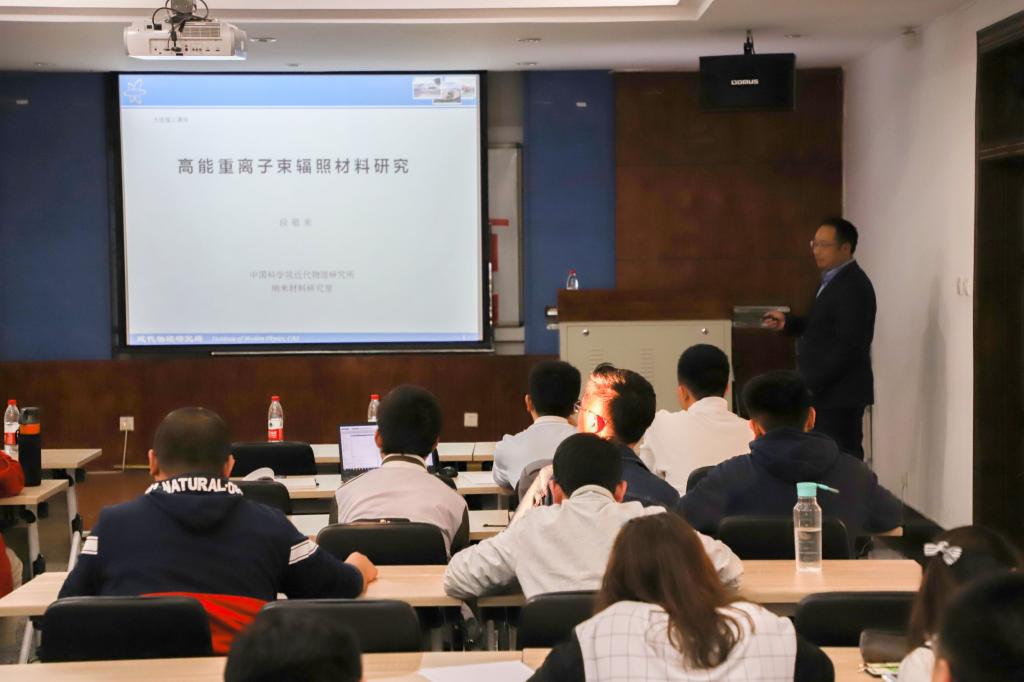 段研究员接下来也为大家带来“高能重粒子束辐射材料的研究”的报告。他从台球碰撞,形象地入手,考虑母球和目标球的运动,深入浅出地解释粒子束碰撞中微观运动的大致形式。他讲解离子在固体中的能量损失,绘制热峰、展示轨迹,让粒子束碰撞的物理模型更加清晰。此外,他还讲述粒子束的前沿应用,并表示希望有更多人才加入前沿应用的行列。