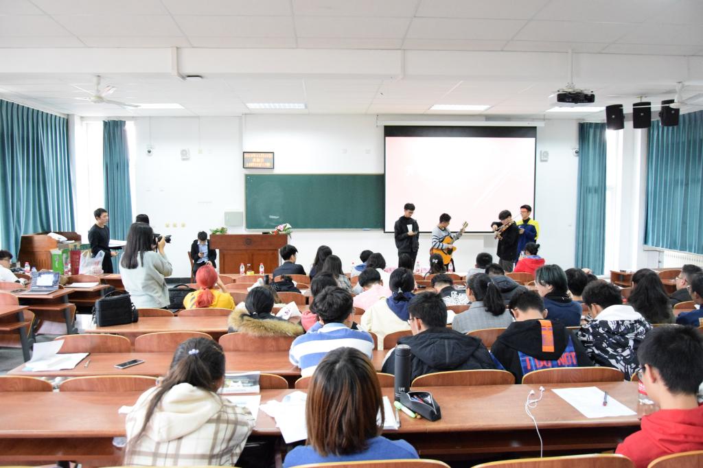 在热烈的掌声中,歌会拉开了序幕。主持人李雨萌同学宣读开场白及评审规则。歌会的评分以“评委为主,全体观众参与打分”为原则,按不同权重计算评委与观众总票数作为选手的最终成绩。第一个节目是由齐含含同学带来的歌曲《新贵妃醉酒》,嘹亮的嗓音立刻点燃了歌会的第一个小高潮。此后各位同学登台献艺,各展歌喉,歌会的气氛愈发热烈,掌声和喝彩声一浪高过一浪。期间,穿插于竞演之中的知识竞赛,舒缓了竞演紧张的气氛,让歌会现场处处充满欢声笑语。