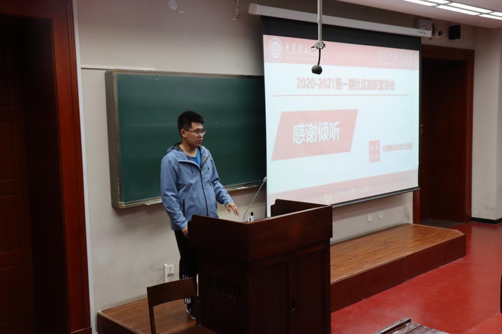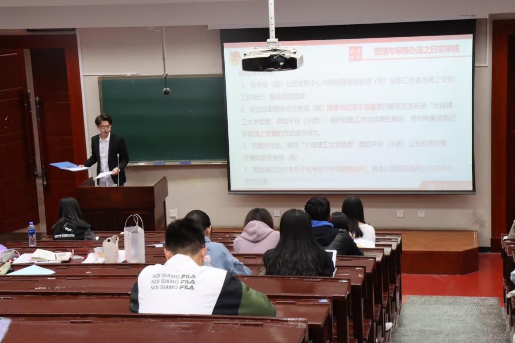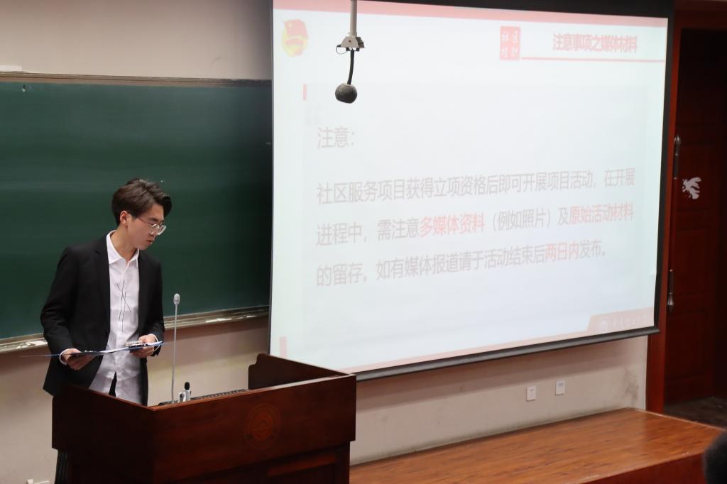 首先由经济管理公司社区挂职部的周俊儒同学介绍社区挂职工作主要的工作项目和内容。他希望此次社区挂职工作者能够积极调研社区、走入社区、深入社区并协助社区工作人员组织团建活动和开展党建活动。周俊儒也对管理与审核的办法进行讲解,主要对周记制度及精品周记挑选制度进行说明,强调对上交优秀周记的挂职工作者将结于一定奖励,对失真、虚假等周记主人不予结业处罚。最后周俊儒简要介绍此次社区挂职工作优秀评比制度。参与社区服务项目的社区挂职工作者将有机会获得‘校社区挂职优秀个人’‘校社区挂职锻炼标兵’荣誉称号。